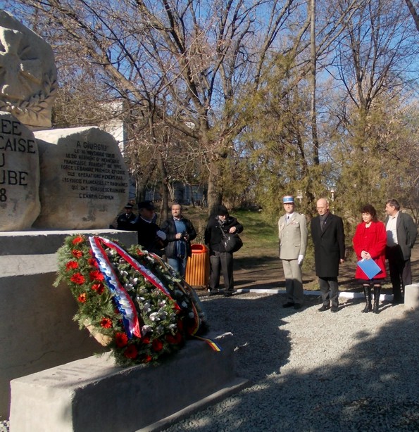 Vizita a continuat în Parcul Alei, la Monumentul Armatei Franceze, ridicat în cinstea eliberării oraşului de către armatele române şi franceze, la data de 10 noiembrie 1918. În cadru solemn a avut loc o ceremonie de depunere de coroane, deschisă de delegaţia franceză, urmată de susţinerea discursurilor de către Excelenţa Sa, ambasadorul Franţei în România, Philippe Gustin, prefectul judeţului, Nina Carmen Crişu dar şi de primarul oraşului, Nicolae Barbu. Cu acest prilej, oficialităţile au amintit despre importanţa luptelor duse în comun de francezi şi români din timpul Primului Război Mondial, dar şi despre momentul eliberării oraşului din noiembrie 1918.