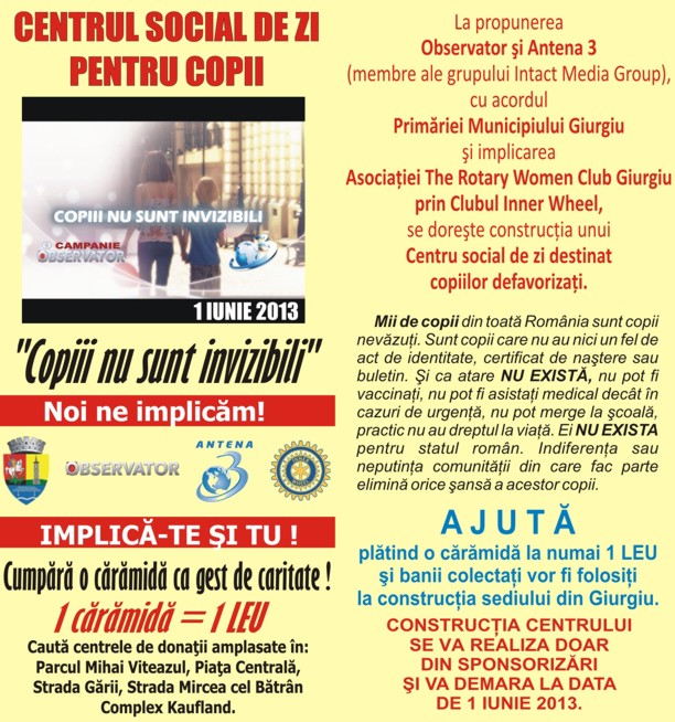 Pentru a da un semnal că solidaritatea este soluţia, Primăria Municipiului Giurgiu, Antena 3/Observator şi Asociaţia „The Rotary Women Club” Giurgiu vor încheia un parteneriat pentru construirea în Giurgiu a unui centru de zi pentru copii. Construcţia centrului de zi are ca scop crearea unui spaţiu adecvat studiului, dar şi încurajarea instituţiilor responsabile să ia măsuri de prevenire a neînregistrării naşterilor.
