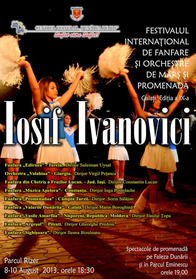 Festivalul Internaţional de Fanfare şi Orchestre de Marş şi Promenadă “Iosif Ivanovici”- GALAŢI 2013 a ajuns la ediţia IX. Organizatorul, Centrul Cultural “Dunărea de Jos” Galaţi, a invitat Orchestra de suflători „Valahia” împreună cu trupa de majorete STEP UP a Centrului Cultural Local Ion Vinea Giurgiu. Festivalul se desfăşoara pe perioada 07 – 09 AUGUST.