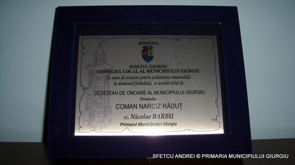 Cel de-al doilea “Cetăţean de Onoare al Municipiului Giurgiu”, sportivul Narciz Coman s-a născut la 5 noiembrie 1946 în Giurgiu, la 12 ani fiind legitimat la Olimpia Giurgiu. A apărat în poarta formaţiilor UTA, FC Argeş, Dinamo, Steaua, SC Bacău, CS Târgovişte, Dunărea Giurgiu dar şi în cea a echipei naţionale de fotbal a României. În anul 1978, giurgiuveanul a fost declarat cel mai bun fotbalist al anului, fiind primul portar român care a primit această distincţie. Maestru al sportului, Narciz Coman a fost decorat cu medalia Meritul Sportiv clasa a III-a şi apare în Enciclopedia personalităţilor din România.