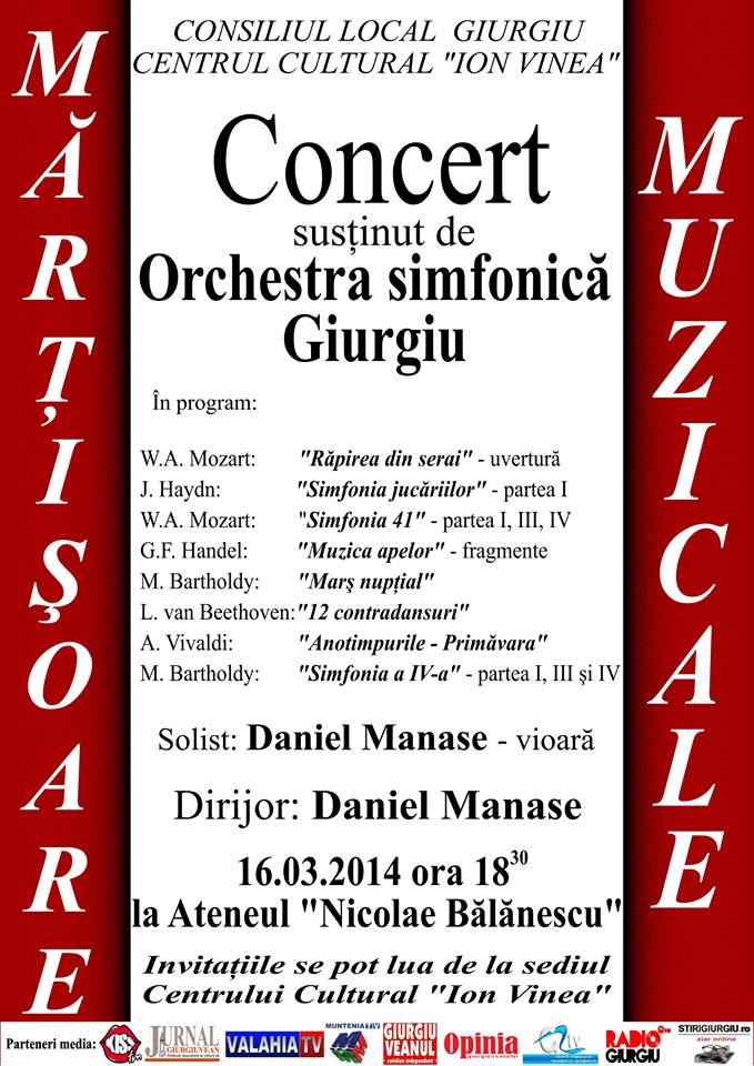 Primăria şi Consiliul Local al Municipiului Giurgiu, prin Centrul Cultural „Ion Vinea”, invită giurgiuvenii iubitori de muzică simfonică la un concert susţinut de Orchestra Simfonică Giurgiu, duminică 16 martie, ora 18,30, la Ateneul „Nicolae Bălănescu”.