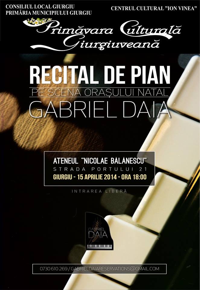 Programul de săptămâna aceasta cuprinde două evenimente: Festivalul Concurs Naţional de pictură „Hristos a înviat”, care se va desfăşura până pe 23 aprilie, şi Recitalul de pian pe scena oraşului natal, susţinut astăzi, 15 aprilie, pe scena Ateneului „Nicolae Bălănescu”, începând cu ora 18,00, de tânărul artist giurgiuvean Gabriel Daia.