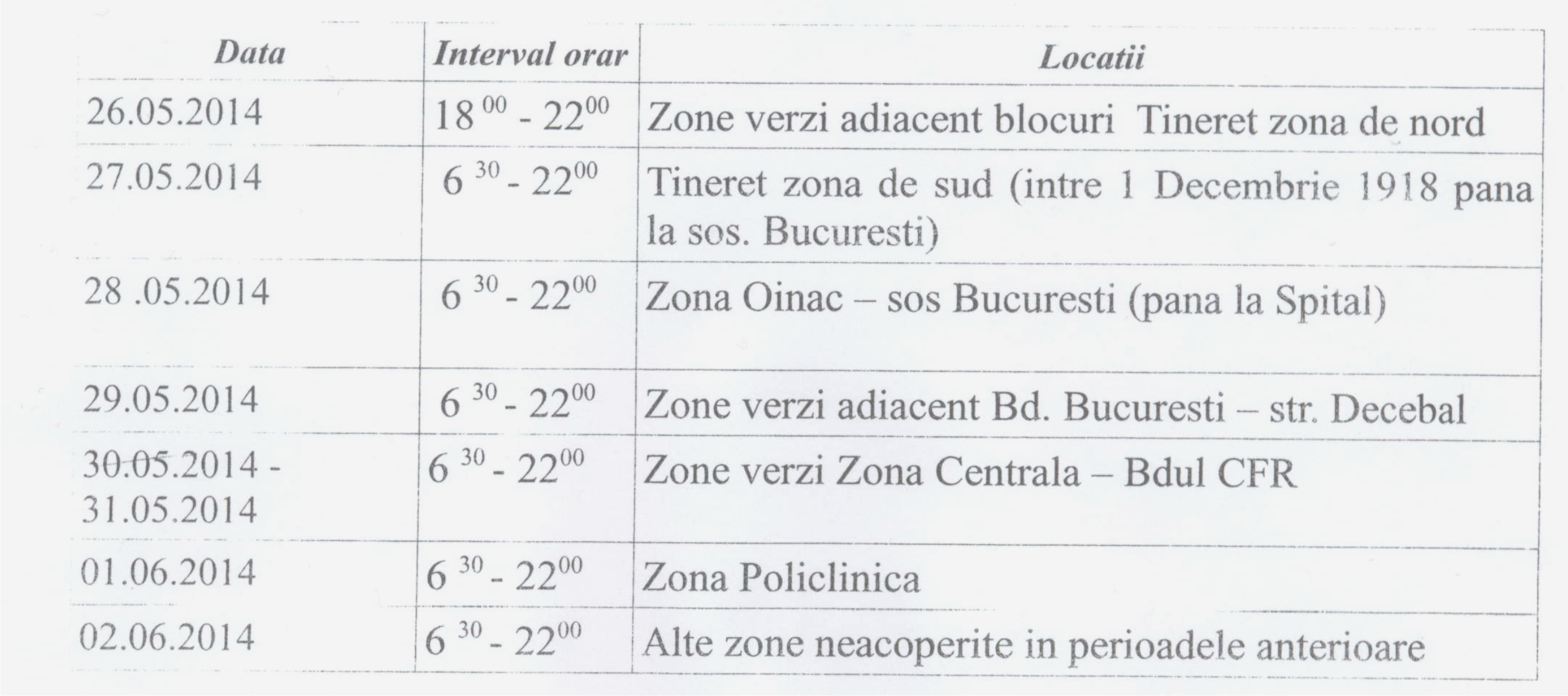 Dezinsecţia a început de ieri, 26 mai şi va continua până pe data de 2 iunie 2014, conform următorului program: