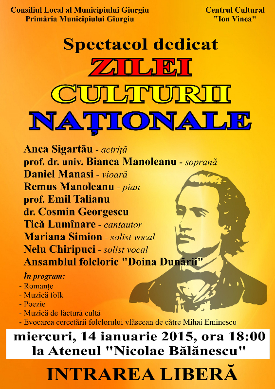 Biroul de Turism “Eastern Danube Convention &Visitors Bureau” şi Primăria Muncipiului Giurgiu organizează în perioada 14-15 ianuarie seria manifestărilor dedicate Zilei Naţionale a Culturii precum şi a comemorării a 165 de ani de la naşterea marelui poet, Mihai Eminescu.