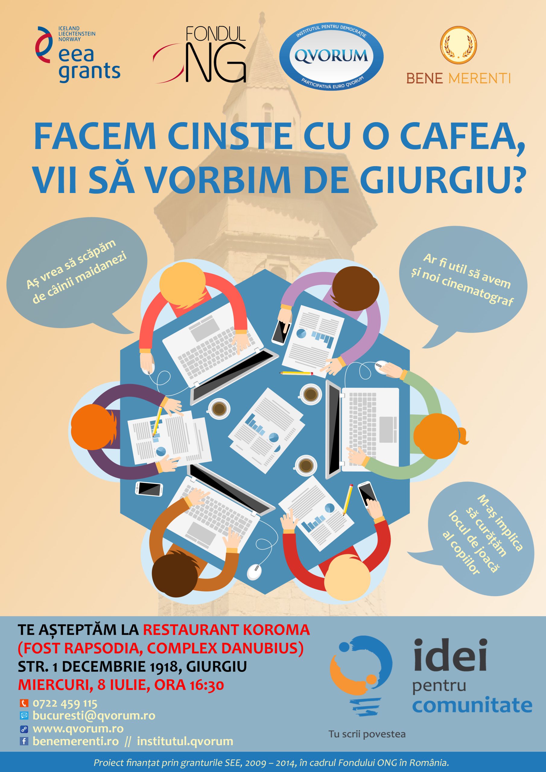 Institutul pentru Democrație Participativă Euro Qvorum și Organizația Bene Merenti vă invită la evenimentul Cafeneaua publică în data de 8 iulie 2015, începând cu ora 17:30, la Restaurant Koroma (fostul Rapsodia), str. 1 Decembrie 1918, Giurgiu.