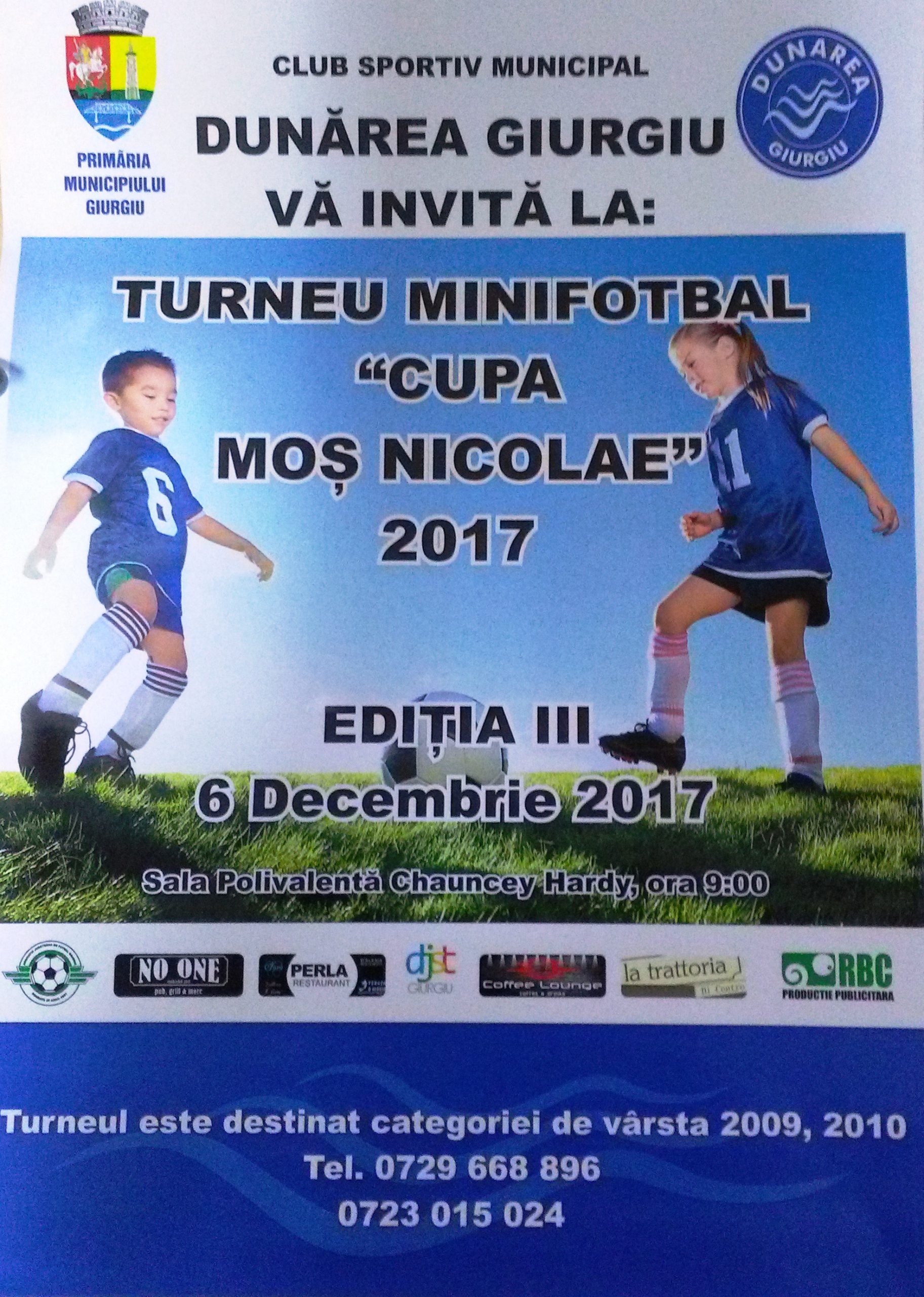 Miercuri, 6 decembrie, giurgiuvenii sunt invitați la cea de-a treia ediție a Turneului de minifotbal “Cupa Moș Nicolae”. Evenimentul organizat de Clubul Sportiv Municipal Dunărea Giurgiu în parteneriat cu Primăria Giurgiu va avea loc la Sala Polivalentă Chauncey Hardy începând cu ora 9.00 și se va bucura de participarea a nouă cluburi sportive din Giurgiu, București, Alexandria, Roșiori, Chiajna și Ruse (Bulgaria), grupele de vârstă 2009 și 2010.
