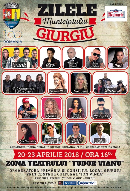 Mâine încep Zilele Municipiului, pe parcursul celor patru zile de sărbătoare, de pe 20 până pe 23 aprilie, giurgiuvenii urmând să aibă parte de un program cultural-artistic bogat, cu spectacole muzical-coregrafice, folclorice, concerte cu artiști consacrați ai muzicii pop etc.