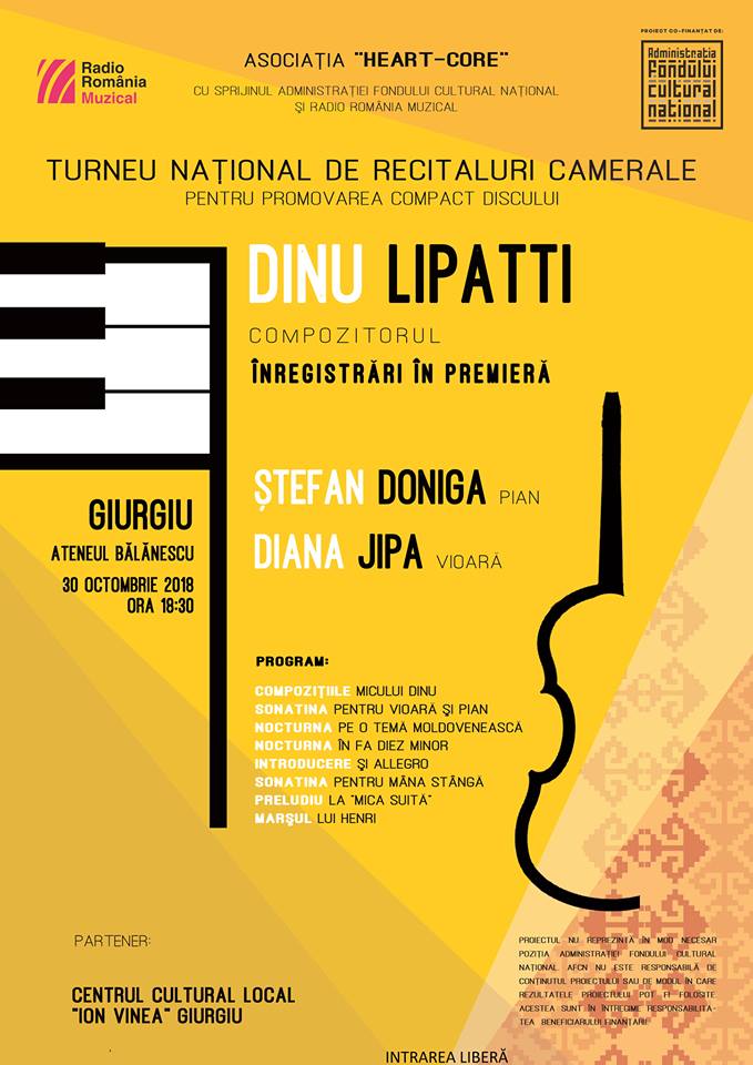 Mâine, 30 octombrie, Ateneul Nicolae Bălănescu va găzdui un recital cameral de excepție pentru promovarea compact discului DINU LIPATTI-COMPOZITORUL, Înregistrări în premieră, avându-i ca soliști pe violonista Diana Jipa și pe pianistul Ștefan Doniga.