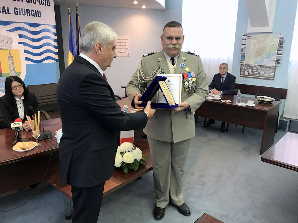 Prima parte a acțiunii s-a desfășurat la sediul Primăriei, în cadrul unei ședințe festive a Consiliului Local. Cuvântul de deschidere a fost adresat de către gazda evenimentului, primarul Nicolae Barbu, urmat de prefectul Adriana Puțaru, președintele Consiliului Județean, Marian Mina și dl. colonel Flavien Garrigou – Atașatul Apărării în România, Bulgaria și Moldova. A urmat apoi un moment de evocare istorică susținut de istoricul Dumitru Preda, după care primarul Nicolae Barbu a înmânat reprezentantului Ambasadei, dl. Colonel Flavien Garrigou, o diplomă onorifică, placheta de excelență și o medalie comemorativă. Medalii comemorative au fost oferite și celorlalți invitați la eveniment. De asemenea, în semn de apreciere pentru implicarea în promovarea acțiunilor de sărbătorire a Centenarului marii Uniri, Primăria Giurgiu a primit din partea președintelui Fundației Culturale Bartoc, Alexandru Bartoc, o diplomă și o medalie cu titlul “Giurgiu – Oraș Erou în Primul Război Mondial”.