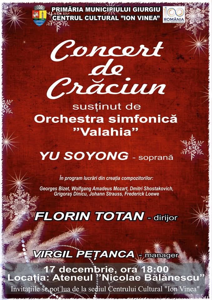 Concertul este organizat de Primăria Municipiului Giurgiu prin Centrul Cultural “Ion Vinea” și va fi găzduit de Ateneul Nicolae Bălănescu începând cu ora 18.00.