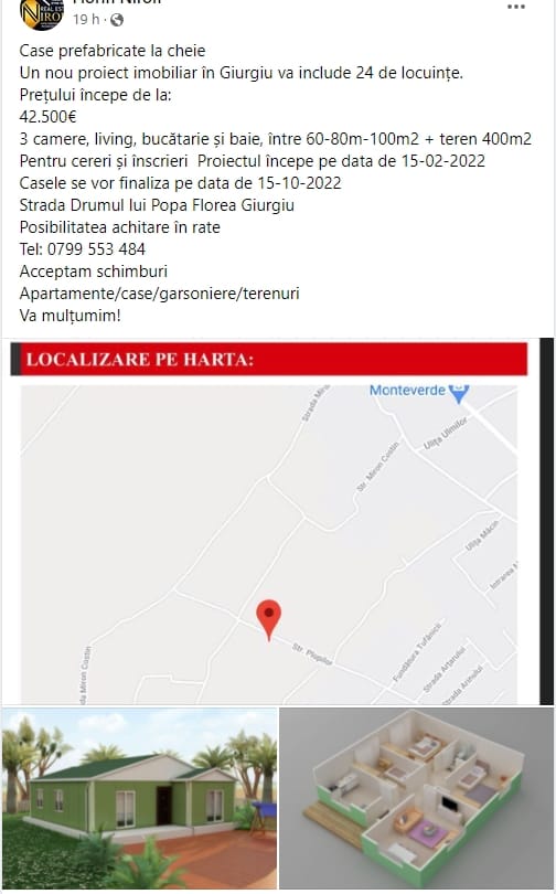 Având în vedere comunicatul postat online atașat prin care dezvoltatorul imobiliar anunță „case prefabricate la cheie […] un nou proiect imobiliar în Giurgiu” – respectiv 24 locuințe, în mun. Giurgiu, str. Popa Florea, ce va fi finalizat în 15 octombrie 2022, vă aducem la cunoștință că Primăria Municipiului Giurgiu nu a emis autorizații de construire în acest scop.