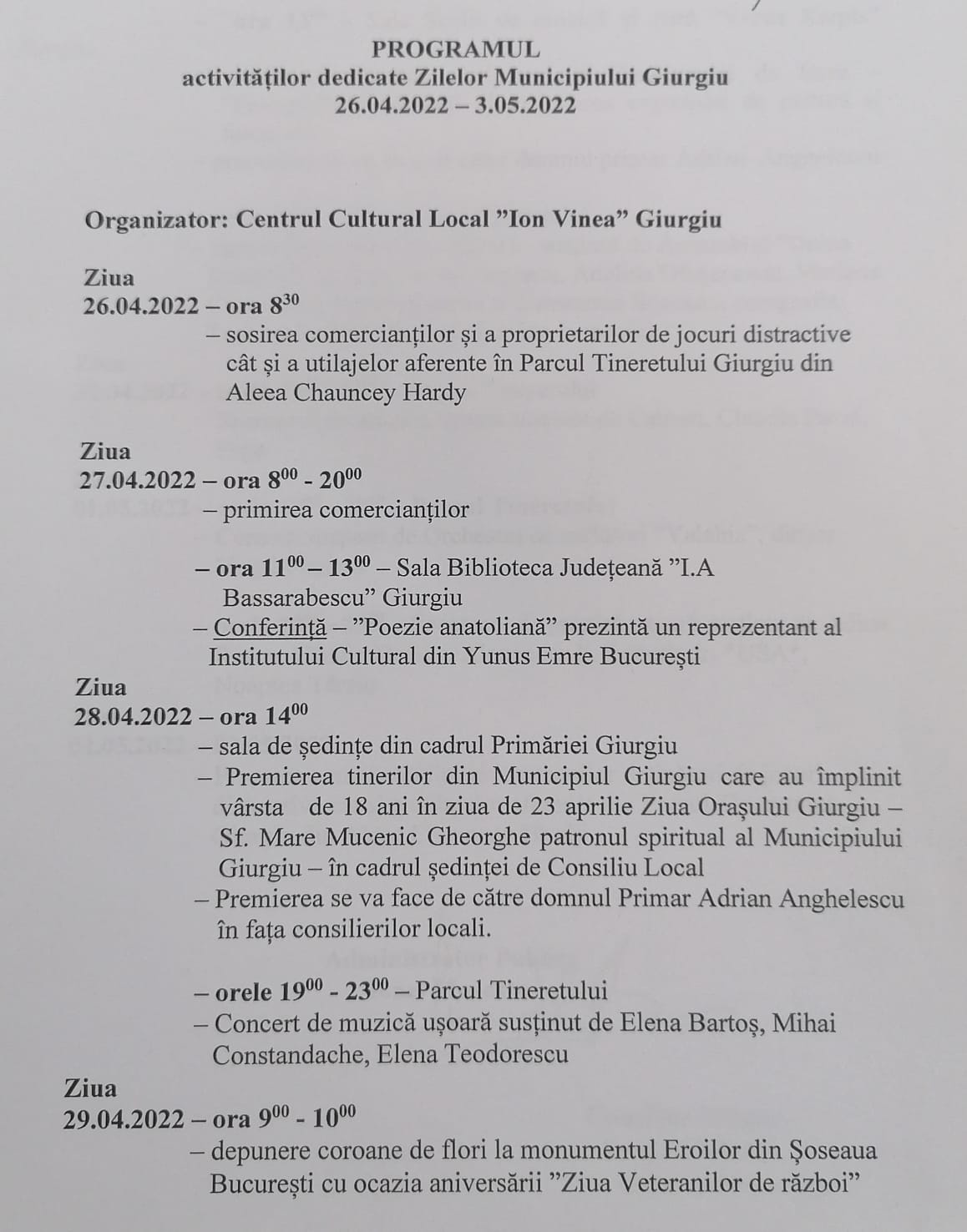 Programul activităților dedicate Zilelor Municipiului Giurgiu din perioada 26.04.2022 – 03.05.2022