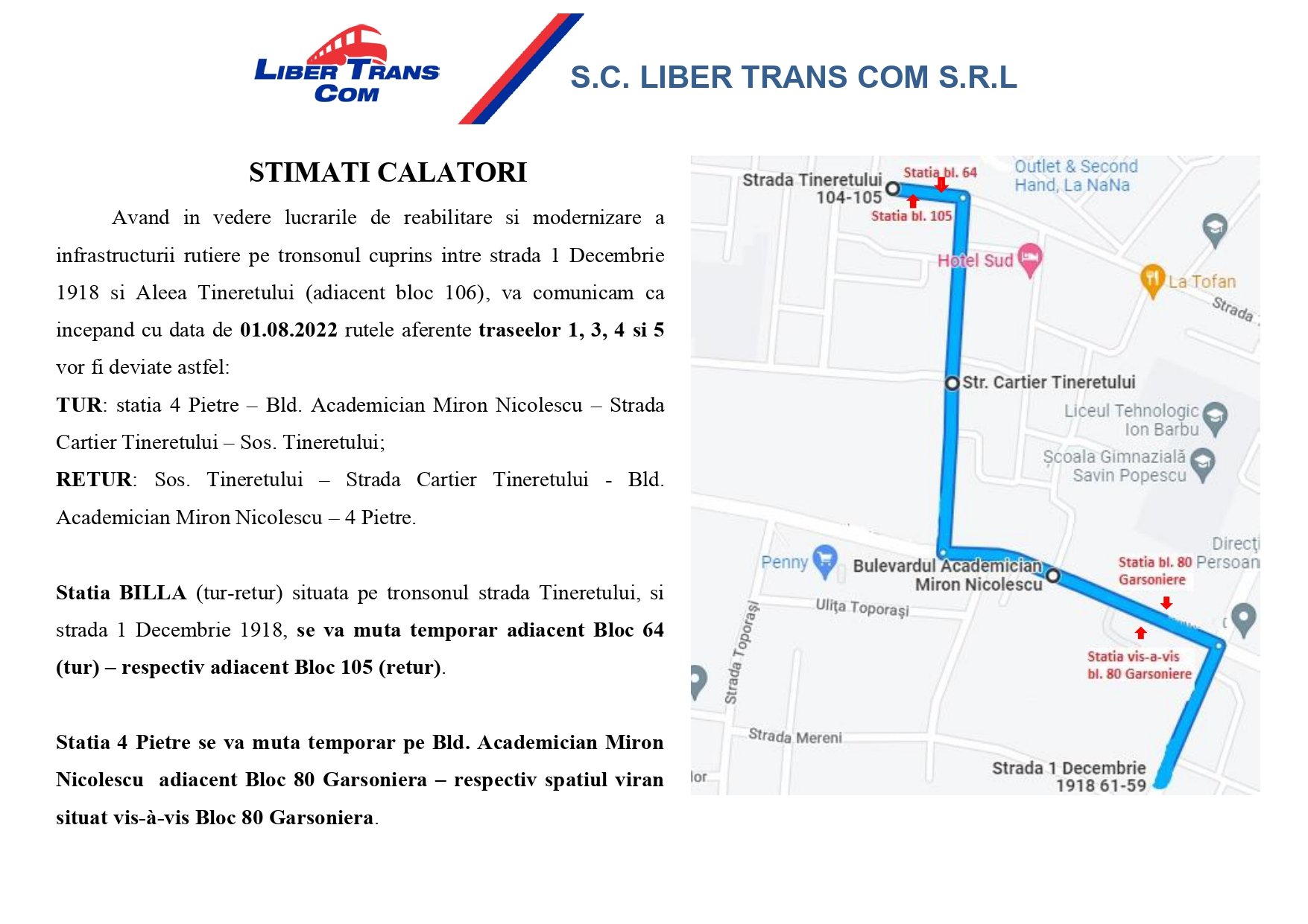 Liber Trans deviază temporar cursele mai multor trasee începând cu 1 august