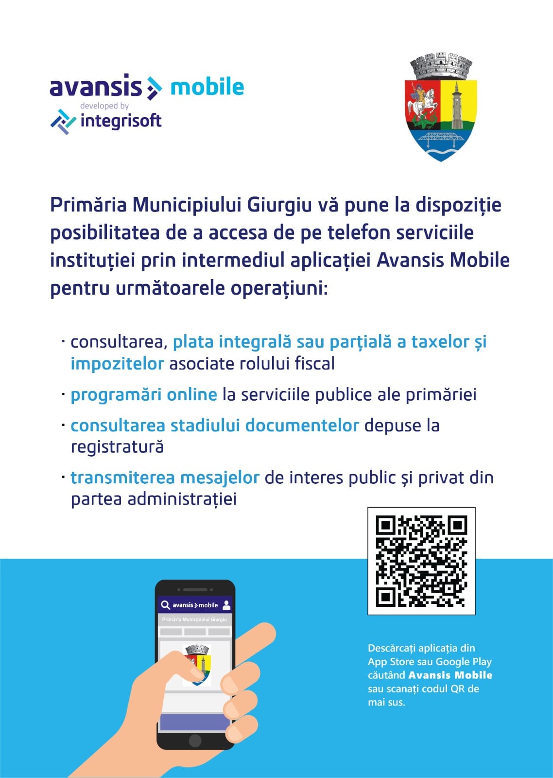 Primăria Municipiului Giurgiu vă pune la dispoziție posibilitatea de a accesa de pe telefon serviciile instituției prin intermediul aplicației Avansis Mobile pentru următoarele operațiuni:
