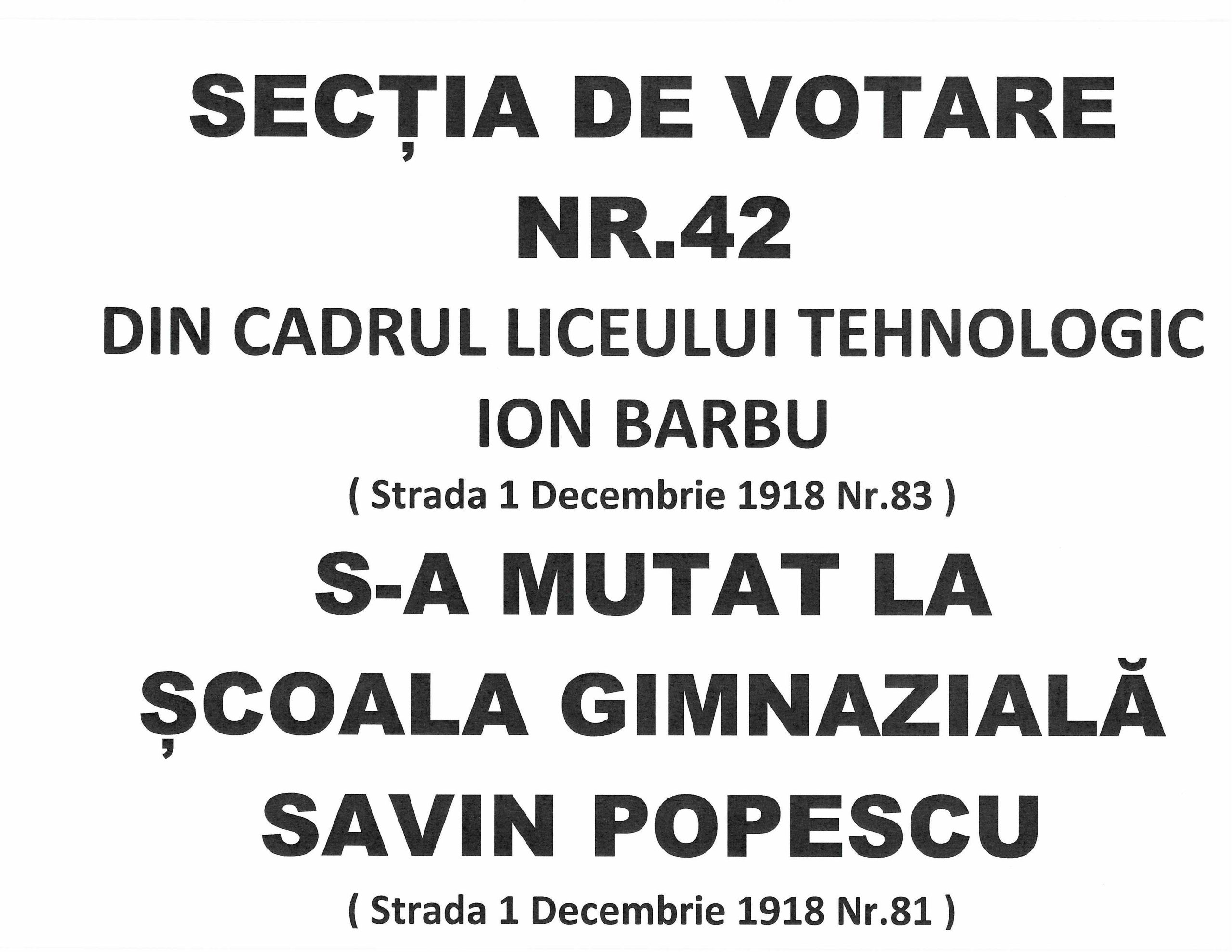 Secția de votare nr. 42 din cadrul Liceului Tehnologic Ion Barbu (Strada 1 Decembrie 1918 nr.83) s-a mutat la Școala Gimnazială Savin Popescu ( Strada 1 Decembrie 1918 nr. 81).