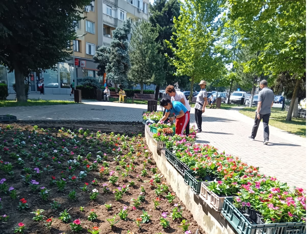 Angajații Giurgiu Servicii Locale continuă plantarea florilor în zonele verzi ale municipiului.